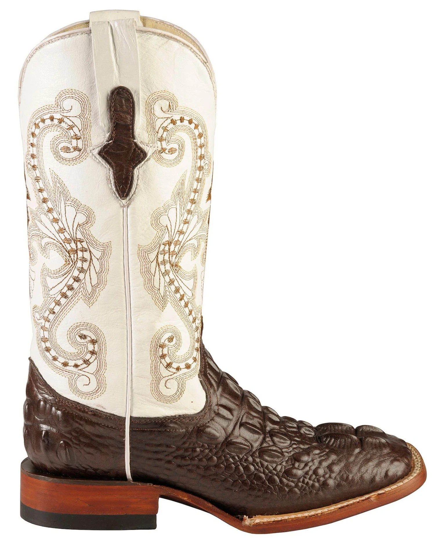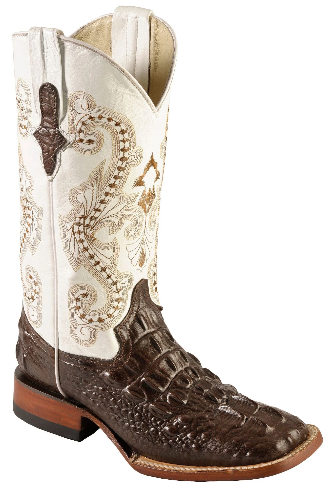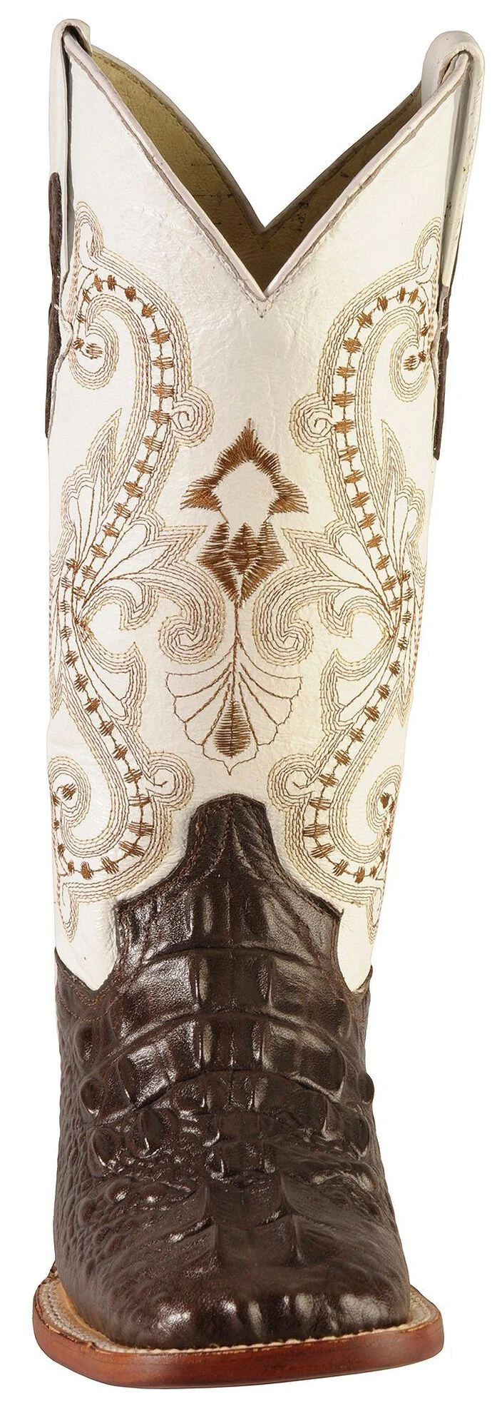 - Brown embroidery decorates bright white leather shaft