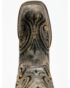 - Distressed brown with black filigree embroidered and inlay designs throughout